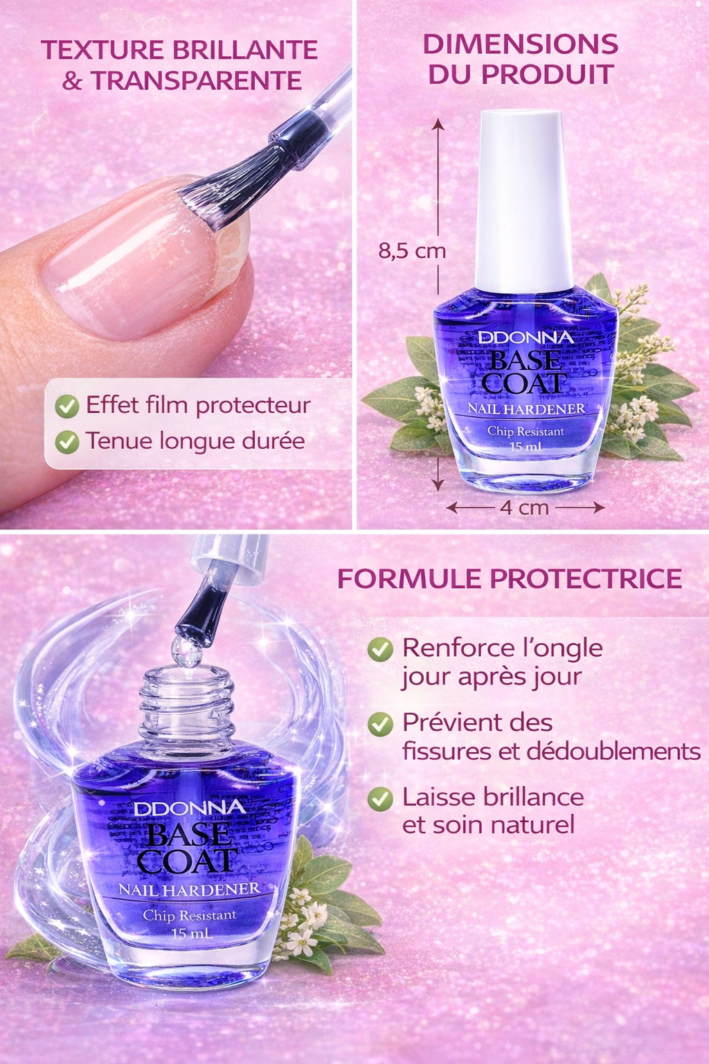Nail Hardener 15 ml Base Coat Durcisseur Ongles – Soin Fortifiant aux Extraits Végétaux – Protection Anti-Casse et Anti-Écaillage – Formule Douce Sans Ingrédients d’Origine Animale